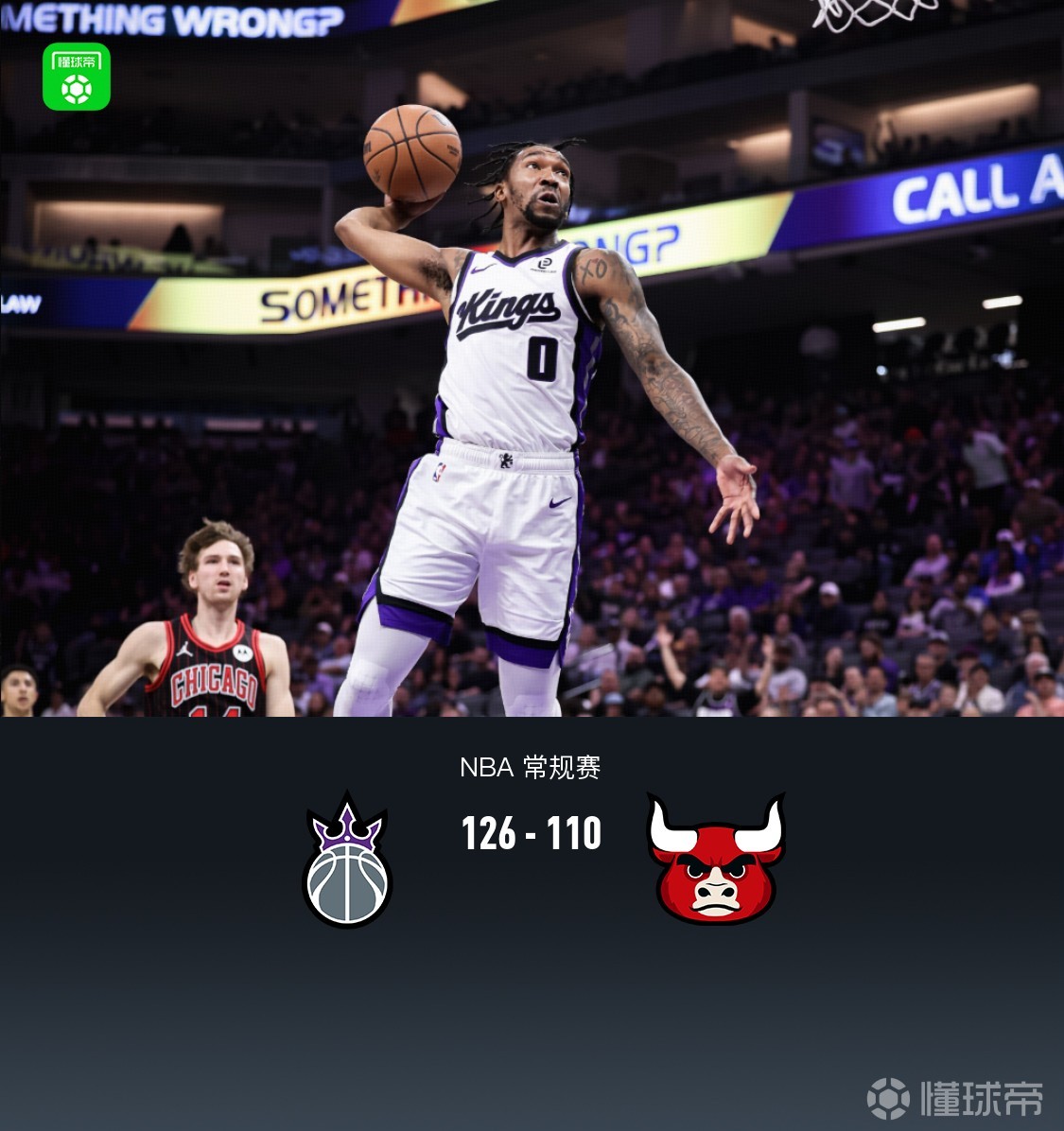 北京时间3月9日NBA 常规赛,萨克拉门托国王对阵芝加哥公牛。半场国王65-51公牛,最终国王126-110公牛。