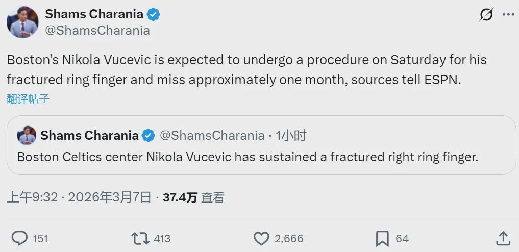 独行侠首发:克里斯蒂、弗拉格、米德尔顿、PJ-华盛顿、鲍威尔。第一节场上出现突发情况,凯尔特人替补中锋武切维奇遭遇无名指骨折,提前退出比赛。Shams补充报道,武切维奇将在明天接受无名指骨折手术,预计缺席一个月。