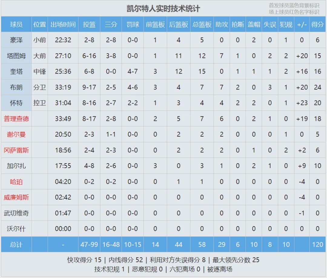 第三节塔图姆找回信心,突破上篮+急停跳投,一个人连得7分。凯尔特人第三节再得32分,分差也来到两位数。三节战罢,凯尔特人90-80领先10分。第四节独行侠进攻断电,凯尔特人轰出一波13-0,分差来到20+,没有悬念了。
